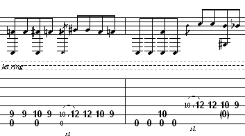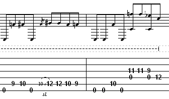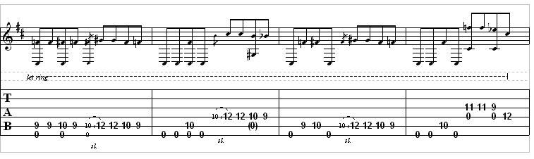 ninth fret. The first measure is done. Practice that a few times to get the feel for it. The next measure is a little easier. You will do this by playing the “low E” twice open (remember that this string is actually tuned down to D, so we’ll call it low D from now on). After you have done that, place your 1st finger on the “A” string and play the tenth fret. Then play the open “low D” once. Now, look at the tablature. Notice that at the end of this measure, you are playing exactly what you played from the end of the first measure, just one string higher. ( There is an open “A” string note in there but that is pretty insignificant.) Remember to play that note, you will need to slide on the “D” string this time instead of the “A” string from the tenth fret to the twelfth fret and play that note twice. Then, you will need to play the tenth fret ( and play the open “A” string) on the “D” string, then slide to the ninth fret on that same string.