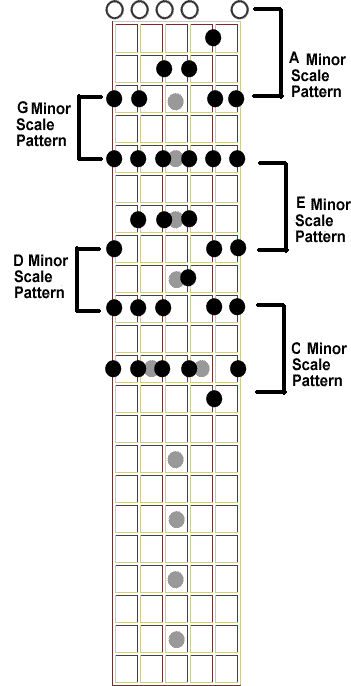 Am Shape Scale SequenceCAGEDIn the diagram below you can see all 5 scale patterns in the key of A minor.Notice how each pattern overlaps.Related posts:Moving The C Scale Shape Around To Play In Different KeysAdding Fills Over The Open G ChordCAGED Major Scale Shapes“A Shape” Diatonic Scale Patterns
