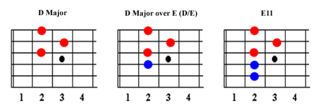 - E Major over D (E/D) – Bass note dropped by step (tone).