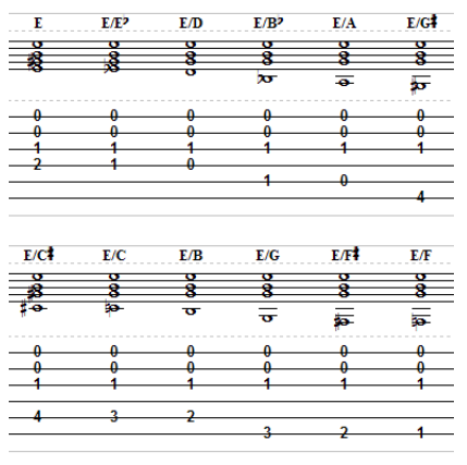 (four tones plus a semitone) - E Major over F# (E/F#) – Bass note dropped by five steps (five tones)