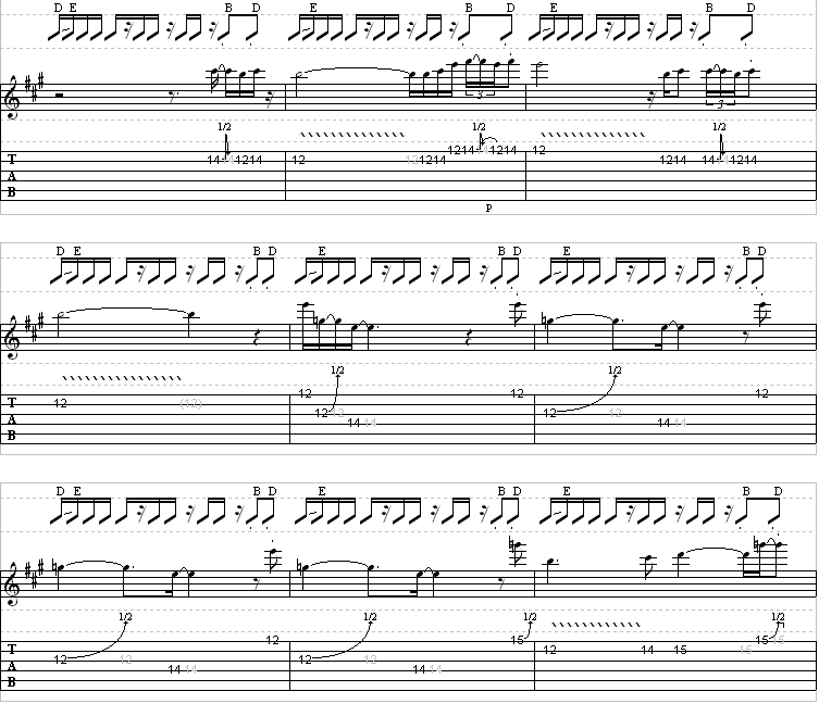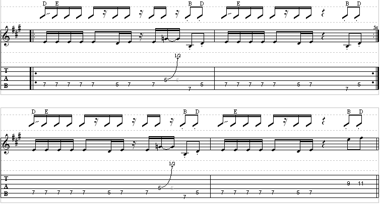 Notes: This time we have two bars at a time, though they are all around the same area of the lead guitar work. Again, pay close attention to your ‘pick-up’ chords B and D.