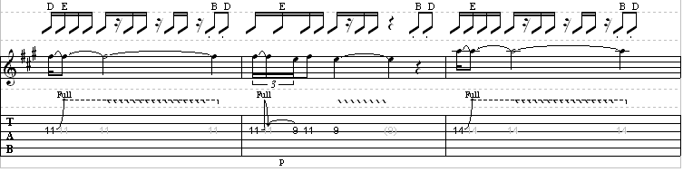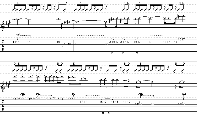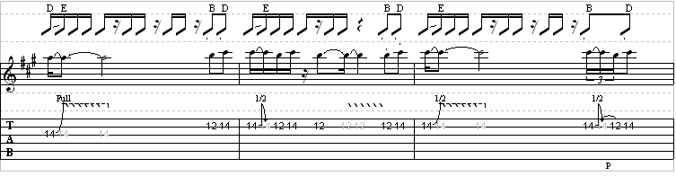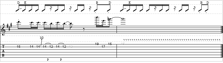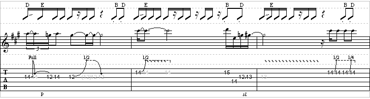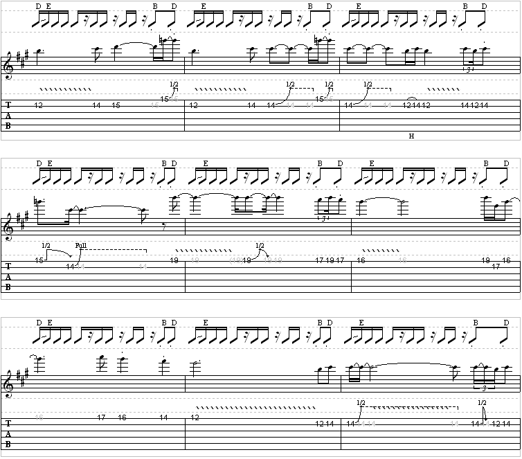 Notes: A nice collection of bends, pulls, and slides, these three measures hint back at the main theme. A good rule of thumb for not only this part but all other solo parts is that you’ll see a recurring guitar theme ALWAYS comes right on the B and D power chords that are dotted in the measures at the top of the tablature staff. This is a great ‘pick-up’ place for lead work.