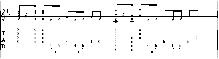 For the verse, you will start off with the D chord. After that, you will need to mute the strings as shown. Try not to skip this step, mainly because it will throw off your timing. Just start slow, and you will get it. When you go into the hammer-ons, try barring your 1st finger on the fourth frets, so that all you have to do then is use your 2nd finger to hammer on to the fifth frets when needed. In the next measure, you are playing a G chord. Once again, following that is the mutes that you definitely want to play. For the hammer-ons in this part, you won’t be so lucky as to barre. Here, you will just have to allow your fret hand to form a quick E chord shape. That will help you in moving more fluently. Just remember to use your 1st finger on the fourth fret as your pivot point, and allow your 2nd and 3rd fingers to roll right on the fifth fret.