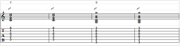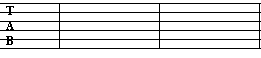 Note: The funny-looking symbol at the far left is a treble clef. This is just signifying that the music staff is for a treble clef instrument (which the guitar is), but it is of no concern to us at this point. We’ll talk about the two 4’s stacked on top of each other right next to the treble clef next.