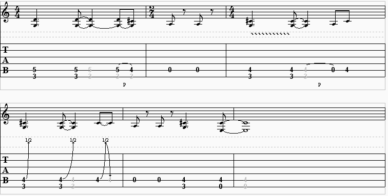 This riff is in 4/4 time except for the 2nd measure in which we switch to 2/4 time (only 2 beats).