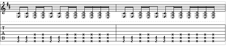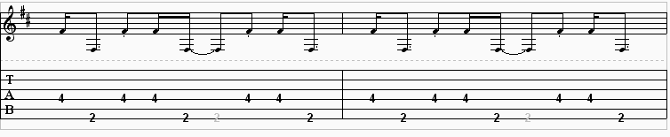 The rest of the intro is equally easy. The key here is the mutes. Make sure you can get those down in time, and the riff will be no problem at all. All you have to do is place your 1st finger on the “low E” string and your 3rd or 4th finger on the fourth fret on the “A” string. There you have it!