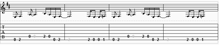The verse is pretty easy, but the timing is strange. Listen closely to the audio example. Also, notice that the first and third measures are the same, as are the second and fourth. Begin the first measure by playing the “low E” string open once, and then continue by placing your 2nd finger on the second fret on the “low E” string. Play the “A” string open, and then use your 2nd finger again to play the second fret on the same string. Play it open once more on the same string, and then go to the “low E” string and play it open once. Then just use your 2nd finger again to play the second fret on the “low E” string to end the measure.