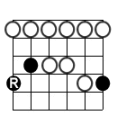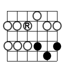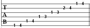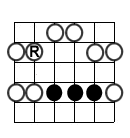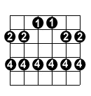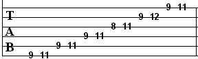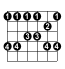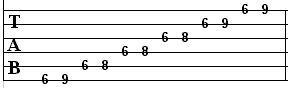 As with all patterns it can be transposed to any key. The pattern remains the same. Here is the same pattern in the key of F, because the root note appears on the A string’s 8th fret, which is an F note.