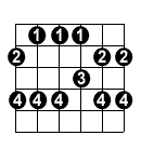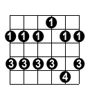 Here is the scale pattern played in the key of C#/Db, because the root note appears on the 4th fret of the A string.