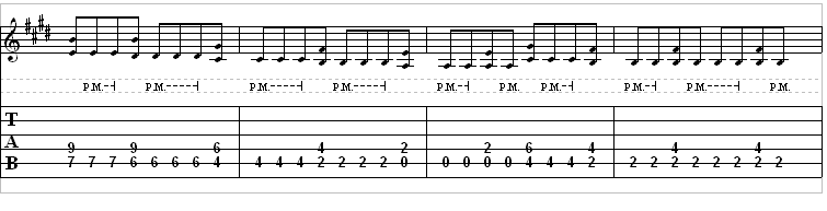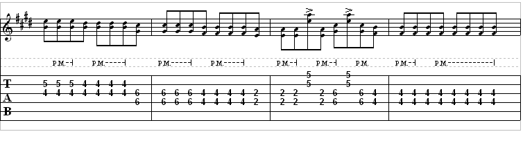 Guitar 1 uses power chords with palm-muted single notes in between. Use all downstrokes and maintain a steady eighth-note rhythm.