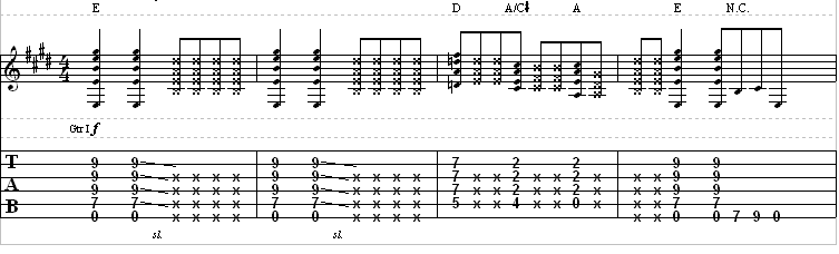 It would be wise to use all downstrokes while picking this riff. If you use alternate down, upstrokes your timing may become confused. If it’s hard to play in its entirety for you, then try playing only the chords and not the muted strings in between. Once you get the hand of that, you can add the muted strings.