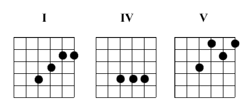 - The fret-relationships within each chord family are fixed. That means if you play in an F formation/I chord, the V chord is the D formation one fret lower in any key. For example: