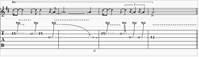 Note – watch closely at the transition from the fifth measure into the sixth, as you will be bending and holding the 14th fret throughout this measure. Transition by sliding into the seventh measure.