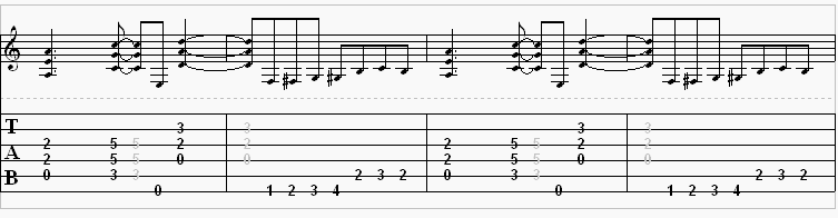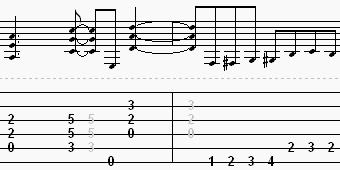 To play the second measure, place your 1st finger on the “low E” string on the first fret. Notice here that you will go from the first, then to the second, then to the third, and then to the fourth fret. A good way to remember this is to relate the finger positions that we usually use to the fret numbers. ( Example: 1st finger = first fret, 2nd finger = second fret, 3rd finger = third fret, and 4th finger = fourth fret.) Understand? Pretty easy? Ok. Now, to play this last part of the second measure, simply use your 1st finger on the second fret of the “A” string. Play that once, and use your 2nd finger to play the third fret once. If you just leave your 1st finger where it is, all you have to do is let off of the third fret and you have finished the measure. That is it for the riff!