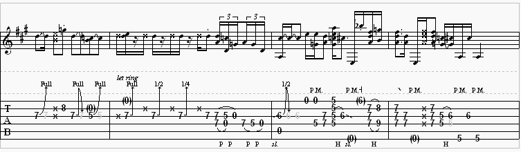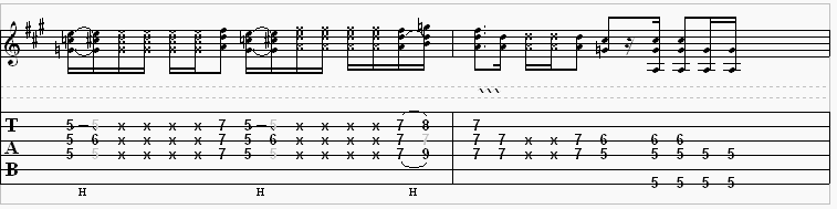 Joe Walsh gets funky with this FM radio classic. The “x” means over the strings, which means you’ll want to mute those strings with your picking hand when picking them. No notes are sounded out. It gives it a percussion-like sound.
