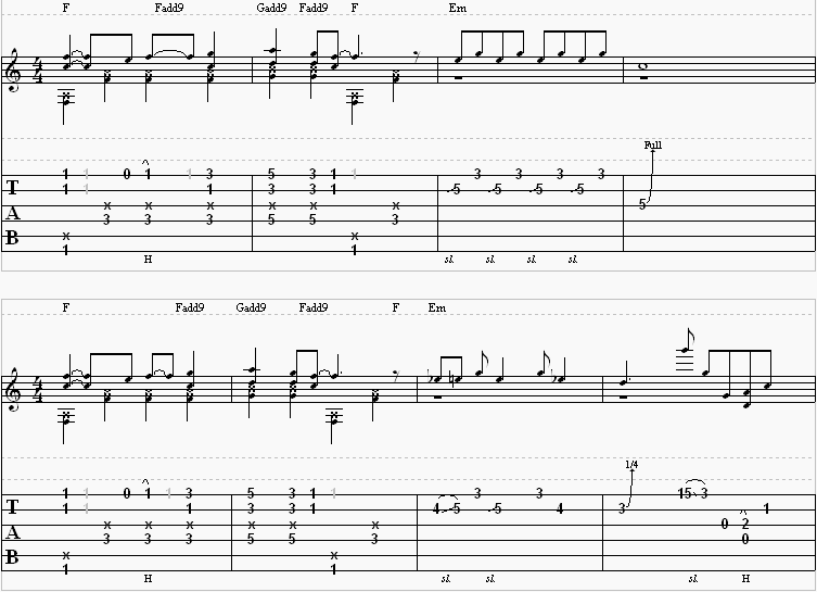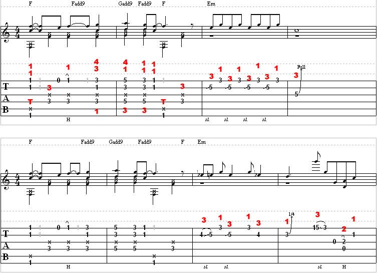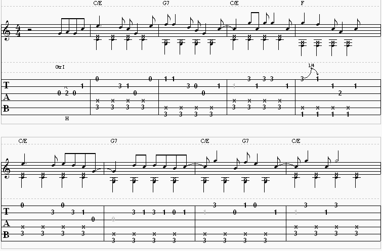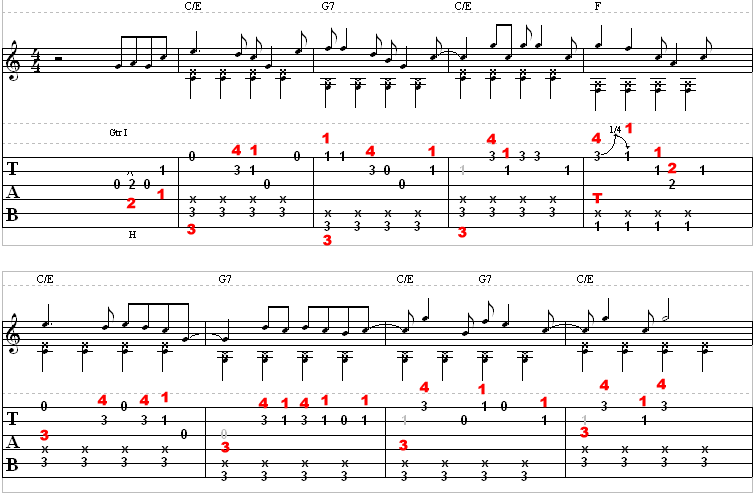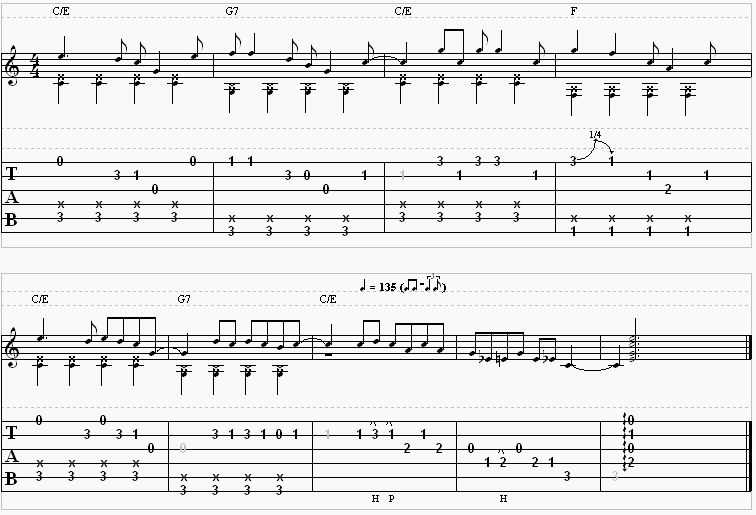 A good thing to keep in mind here is that you will have those 3’s and 1’s as bass notes. Remember to use those notes to keep the timing correct. The speed in this section is 148 bpm (beats per minute). It will change at the end of the bridge.