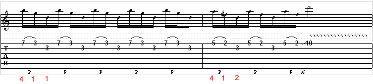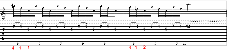 I’ve broken the section down into 4 parts. Practice each part separately then try to put it all together. This is the easiest guitar part of the 2 harmony parts. It’s really not that bad except many of you may not be used to using your 4th finger quite so much. It does require a large stretch in several places, too. Just dive in and go for it!