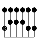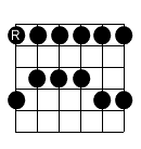 Since there are 12 different keys signatures you need to know the root of each scale pattern. You will see that each scale pattern shares the same root note as the chord form that is associated with them. The root is marked by an “R” in each chord pattern highlight diagram for each scale pattern like in the example below: