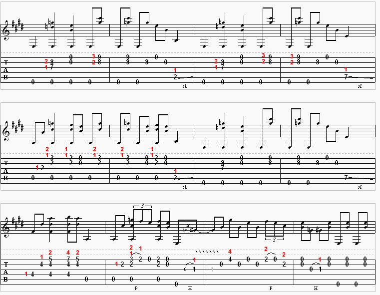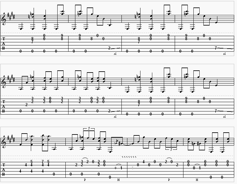 You should fingerpick this one. Notice the constant bass quarter notes one the low E and A strings. You should pick these with your thumb.