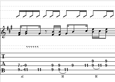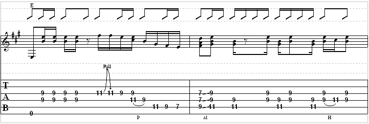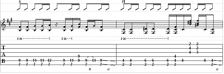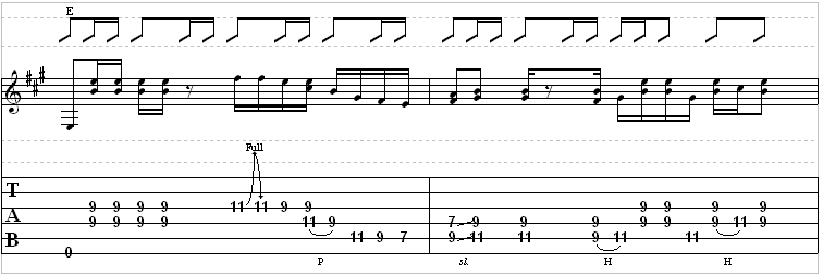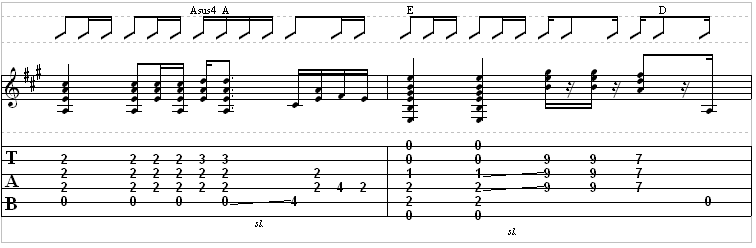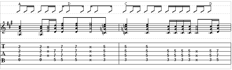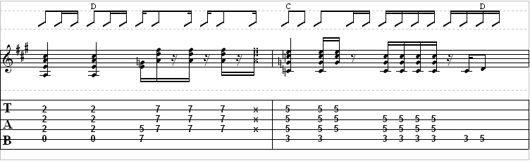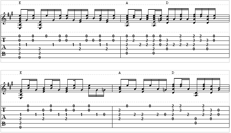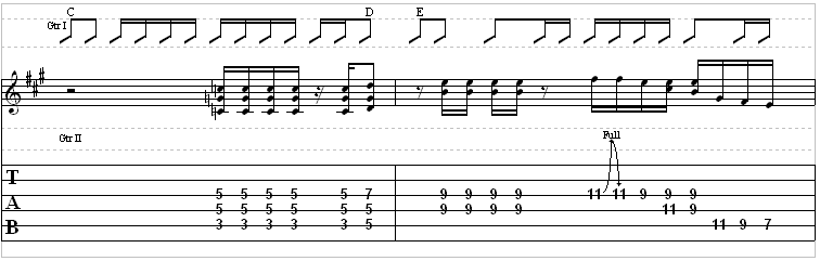 The same applies here, using two guitars. The opening chord of the measure below is an E, which then transitions into the D.