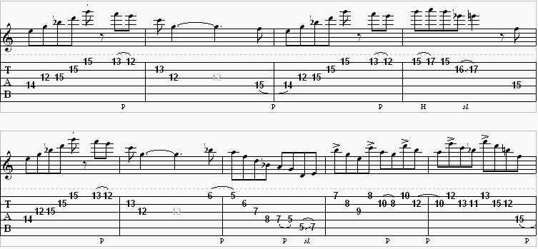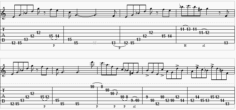Ok. This riff will be pretty difficult to learn, but a challenge is always good, right? This riff will be broken down a little so that the parts aren’t quite so daunting to learn. The riff is full of pull-offs, hammer-ons, and slides. It has two guitar parts playing harmony.