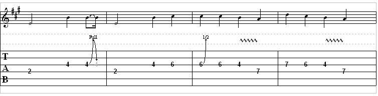 What you’re hearing is 3 guitar parts. The 1st plays the riff as illustrated above. The next guitar is playing a A, C#, D, Dm. The chords change with each measure. The 3rd and final guitar is playing the above melody an octave higher. To do this you’ll want to play everything the same, only 12 frets higher. For example the first note will be on the 14th fret (2+12=14).
