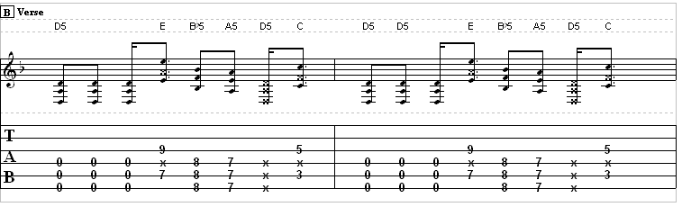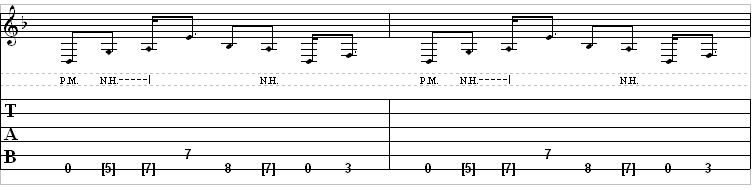 Palm mute the first note to keep the note from ringing. Play the natural harmonic (N.H) on the 5th fret with your 1st finger and the natural harmonic on the 7th fret with your 3rd finger: