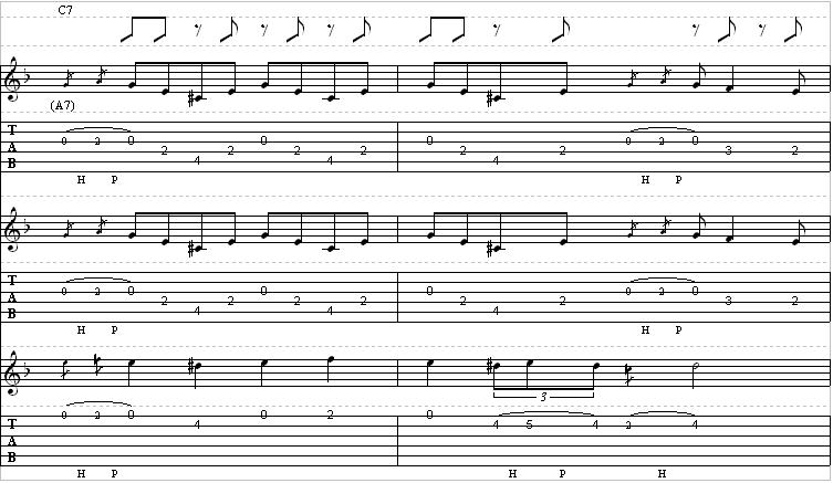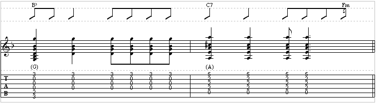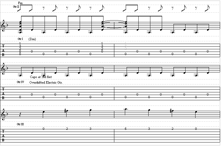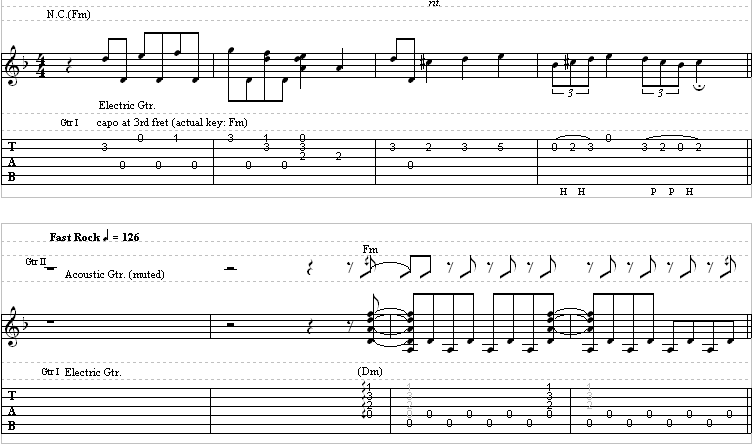 Guitar 2 is in standard tuning, electric, but with a capo on the third fret.
