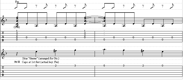 Guitar 3 is the sitar, which is in standard tuning, electric, with a capo on the first fret.