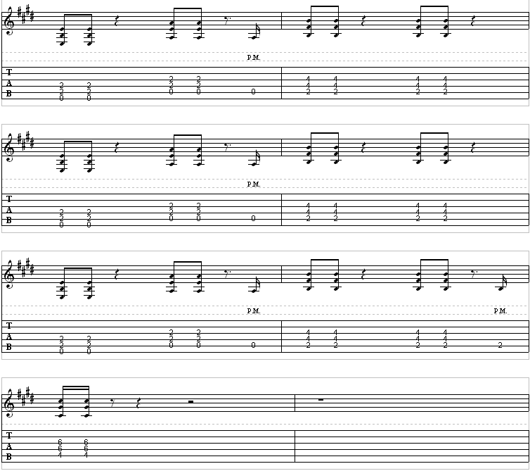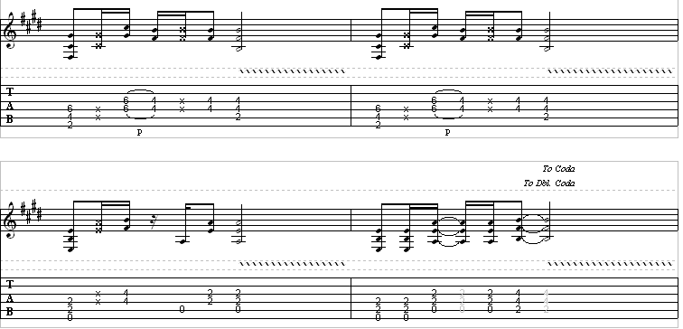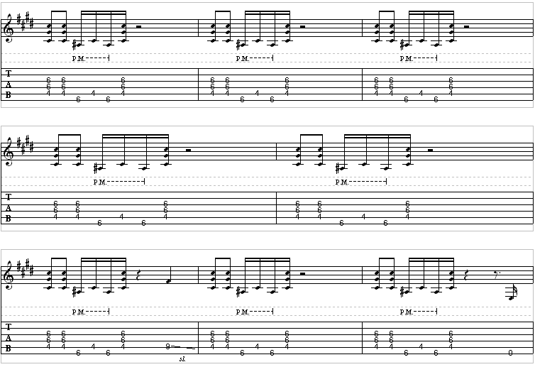 The chorus is played as below, but after the tab shown, you will just be repeating the main riff, so I didn’t include it.