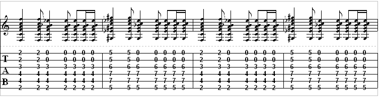 For this riff, you’ll use an E shape barre chord on the 2nd fret and then lift up the 1st finger over the B and high E strings.