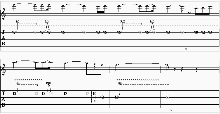 These series of riffs from Still Got The Blues is definitely challenging. You will begin the first measure by performing a 1/2 bend. The good news is that for the first measure you will only be playing this note continually and bending it. The bad news is it gets much harder. Notice that this guitar part is the lead part. Use your 3rd finger to bend this note. Notice the dotted lines at the end of the first seventh fret during the bend. This will signify to you to hold the bend until you begin the next picking transition.