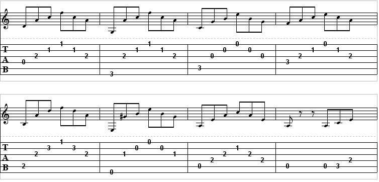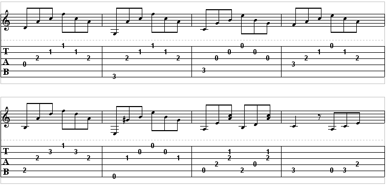 In the last measure of this part, you will be playing what appears to be almost a C chord. Here, just use your 3rd finger to play the third fret on the “A” string and use your 2nd finger to play the second fret on the “D” string. Don’t forget to play the open notes at the beginning of the measure.