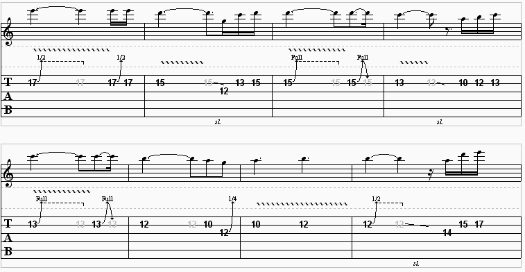 For the first measure of the solo, notice that it is the same as the first guitar part. This is also the case as with the third measure, the fourth measure, and the fifth measure. For the second measure, you will need to play it much the same as the second measure of the first guitar part, but there is an added