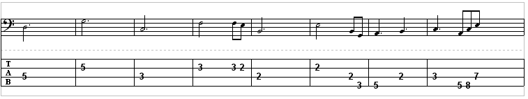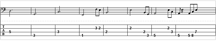 The bass part on this is pretty fun. To begin the measure, use your 3rd or 4th finger to play the fifth fret on the “A” string. Then, use your 1st finger to play the third fret on the “E” string. Move to the “A” string