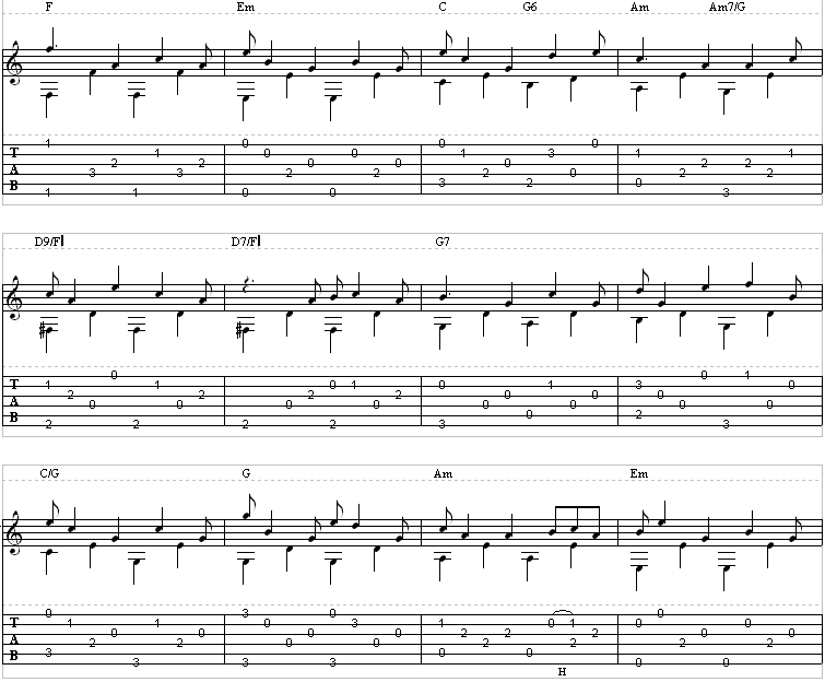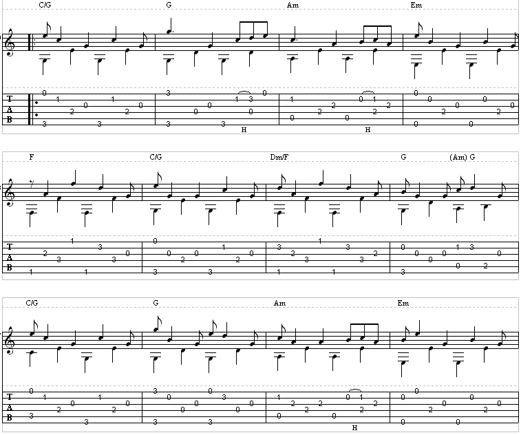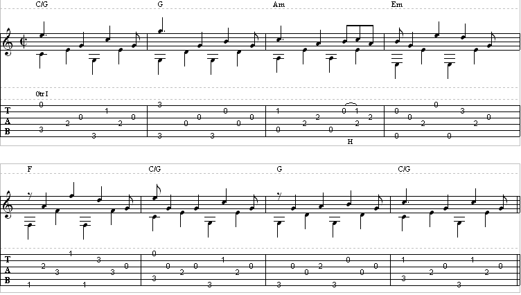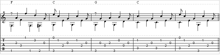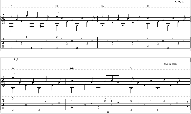 Below you will see a “To Coda” at the end of the bar. This means to play where you see the 1.3 marked below. However, directly after you play the 1.3 that is marked, you will start back over with the verse theme straight into the chorus, up until you see the same “To Coda” as below. Then, you have the option to play the song the same way again, this time using the “2” that is marked. Since the song just repeats and repeats, I have started and stopped the audio below on the very last bar,