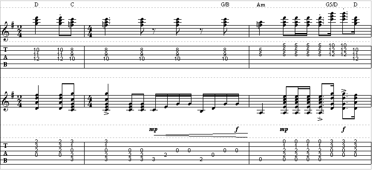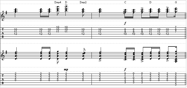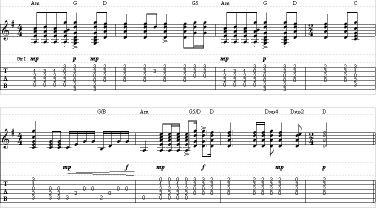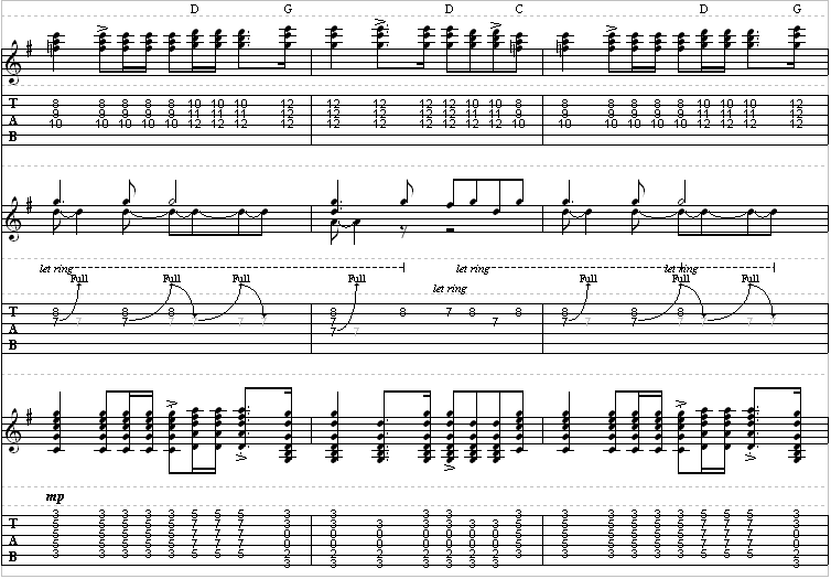The verse theme has two guitars. Guitar II is transcribed from a mandolin, and it’s in standard tuning. Guitar I is the acoustic from above continuing into the verse.