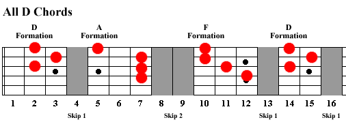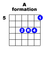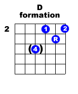 The “4” in the D formation is in parenthesis because it is an optional note. The top three strings alone comprise a major chord. The root of the D formation is technically played with your 3rd finger. The root of the A formation is played with your 3rd finger. The root of the F formation is played with your 3rd finger.