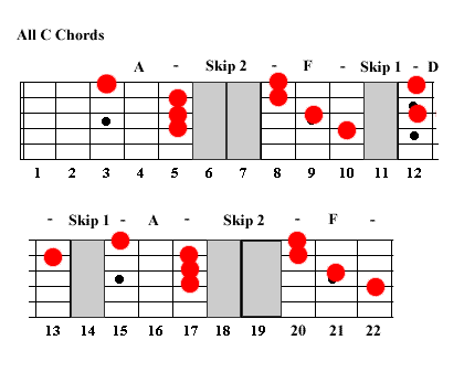 The drill this point in, here are all the C chords, starting with an A formation/C chord. Now it becomes A F D.