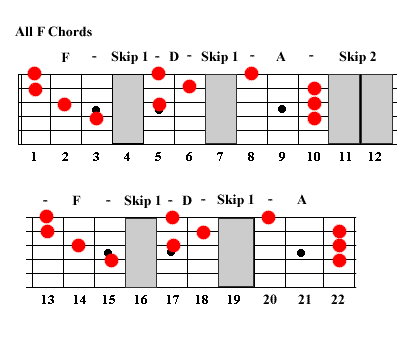 Do you see that you can climb the fretboard starting with ANY chord formation? To play all the F chords, you start with an F shape, so the DAF in turn becomes F D A. It is simply a continuous