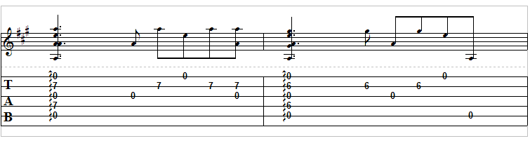This song is tuned to E, A, D, A, D, E, so make sure you do that before you begin to play! The vertical lines at the beginning of the measures will tell you to perform a “rake” on the strings. Do this by just strumming downward on the strings to sound each note in succession.