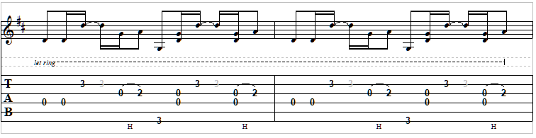 The change from D to G occurs in every measure. 2 beats on the D chord and 2 beats on the G chord. In the original recording, the rhythm is not strummed but fingerpicked as below.