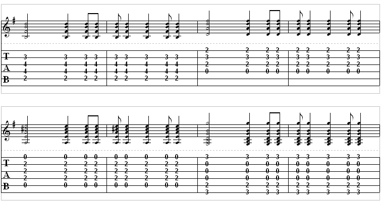 progression begins with a Cadd2, back into the G, Am, F, and finally the G from earlier. You should now notice the recurring theme of the song.