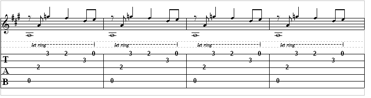 To play this riff, go ahead and place your 1st finger on the second fret on the “G” string. Now that you have done that, place your 3rd finger on the third fret on the “high E” string. Now, play the “A” string open, then play the “D” string, and then play the “high E” string. Next, take your 3rd finger off of the “high E” string and play once on the second fret with your 2nd finger on the “high E” string. Then, place your 3rd finger on the third fret on the “B” string. End the measure by playing the “high E” string once.