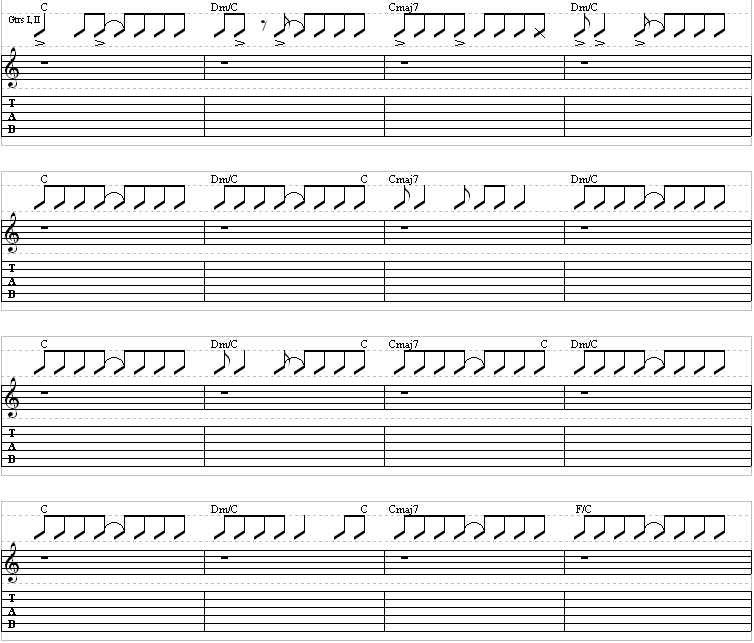 This is actually the intro riff for “I’ve Seen All Good People,” but we transition, so I included it. This is all one guitar part, and the theme recurs a few times.